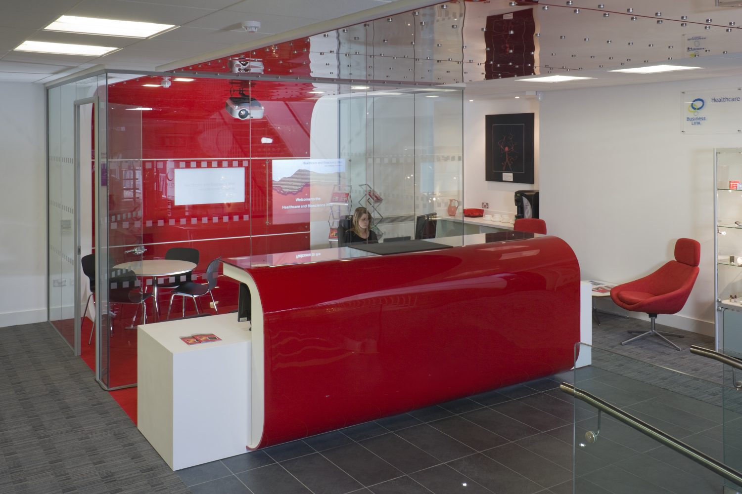 Colour combined with creative illumination, views into and through glazed walls, the choice of materials on horizontal and vertical surfaces, loose and fixed furniture, window treatments, ceilings and selective artwork all contribute to the visual coherence of the whole and can reinforce a brand or corporate identity. The interior architecture / design can also promote through its openness, light, colour and texture a progressive, positive attitude.