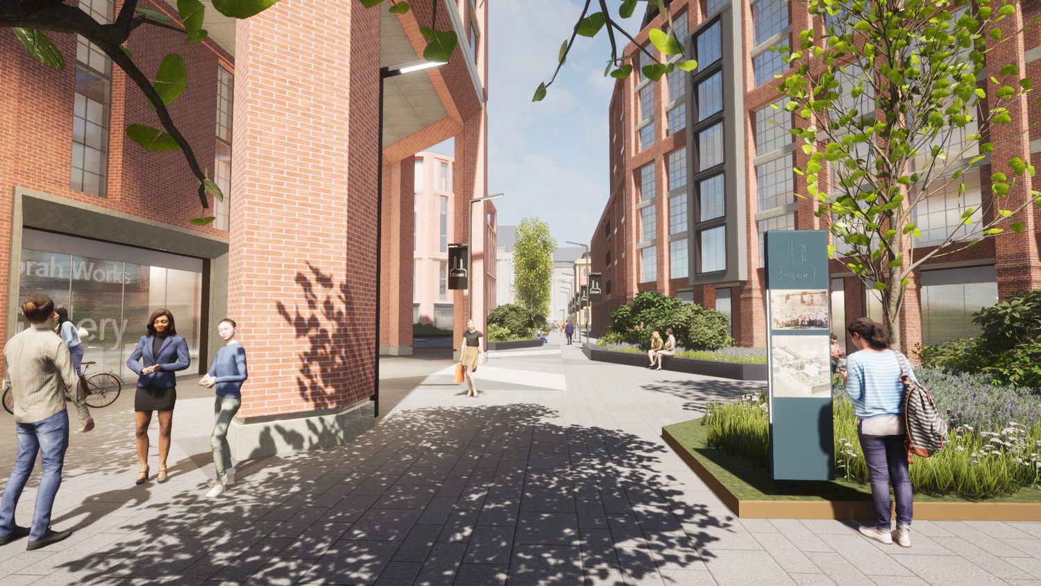Corah Green is also being repurposed as a civic space, alongside a new canal side-park, play areas and tree planting.