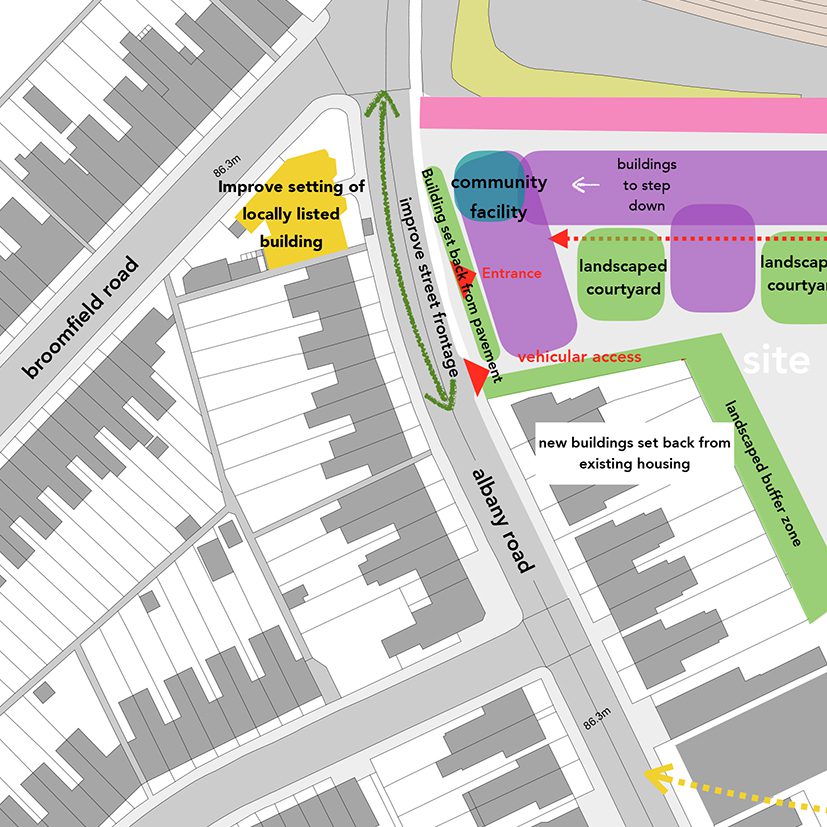 The new block fronting Albany Road is 2-storeys with accommodation within the roof space, constructed of red brick and a pitched roof but in a contemporary style. This block creates an active street frontage and respects the setting and the locally listed public house opposite.
