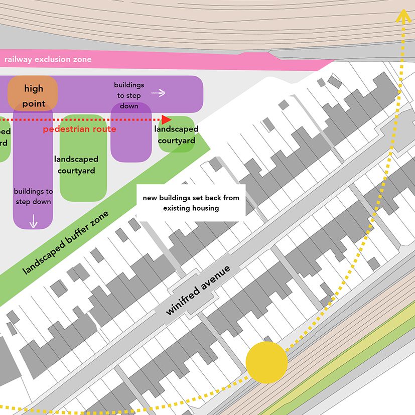 The development consists of a series of connected blocks which vary in height, rising up to 6-storeys towards the railway facing the larger scale developments to the north of the site, and stepping down in height towards the adjacent housing. The blocks are articulated to suggest a composition of smaller buildings.