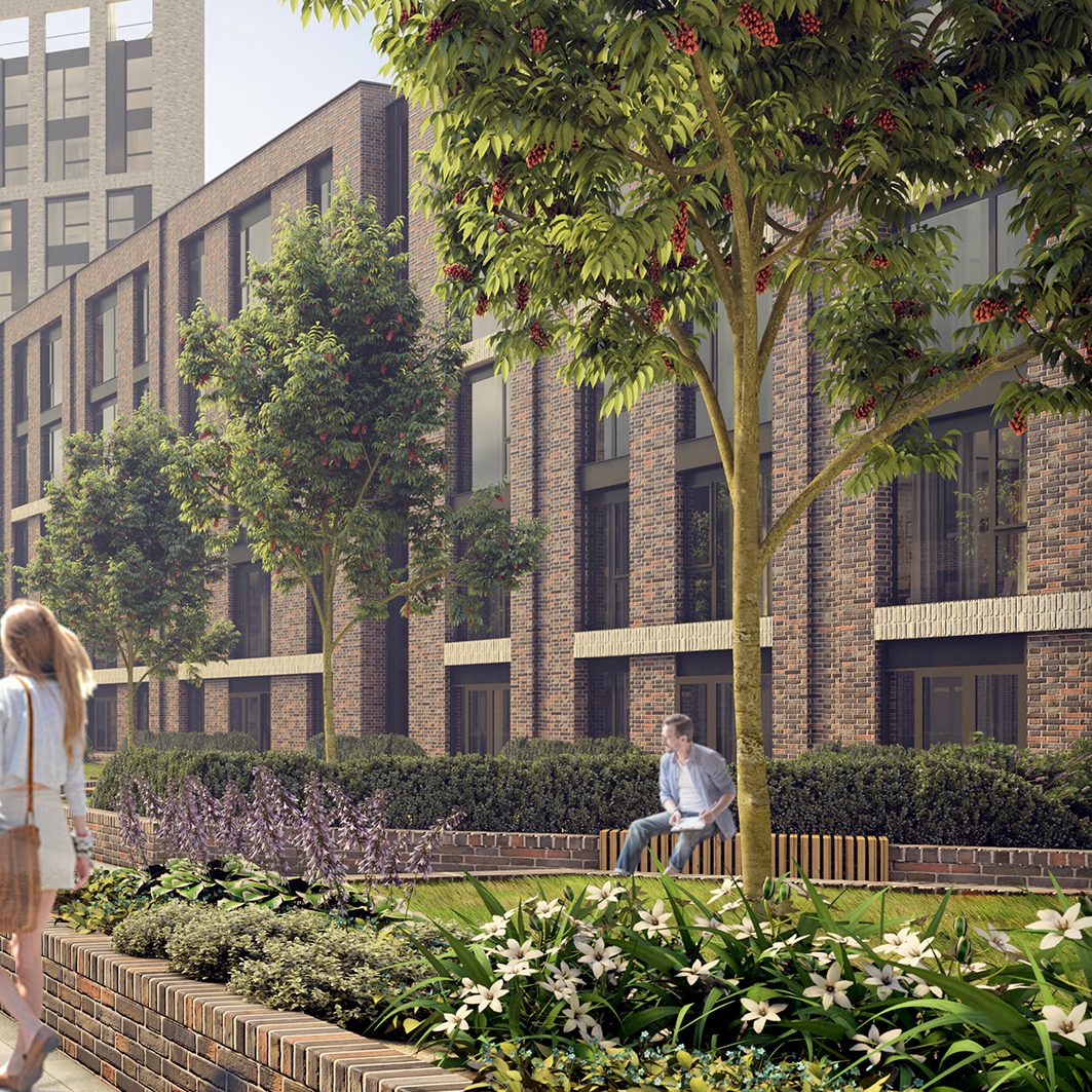 The remainder of the scheme, which encloses the site and repairs the street frontage is a mix of 6 – 4 storey development. The 4 storey element is located to the south of the site facing onto Meadows Way and the lower scale residential area of the Meadows opposite. The scale of this element has been broken up and conceived to appear like a terrace of town houses with a landscape buffer between the frontage and the pavement, providing gardens and defensible space for the occupants of the ground floor units.