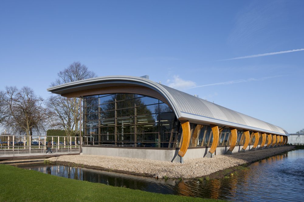 The building includes a dramatic metal curved roof south wing with a laminated timber structure. This interlocks, and contrasts with, a simple brick clad three storey north wing. A landscaped lake wraps around the building, forming both a valuable wildlife habitat and helping to manage rainwater.