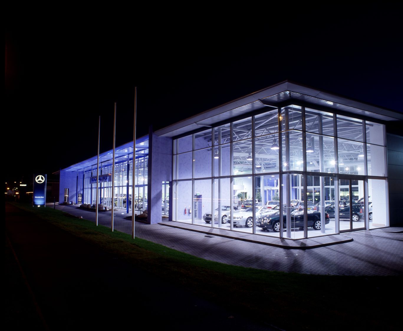 East Midlands dealership on Derby’s Pride Park. The scheme provides a quality showroom for new and used car displays with sales office and customer reception areas. A central drum serves as a focus for all customer facing areas. The simple and elegant design is consistent with the brand image and product.