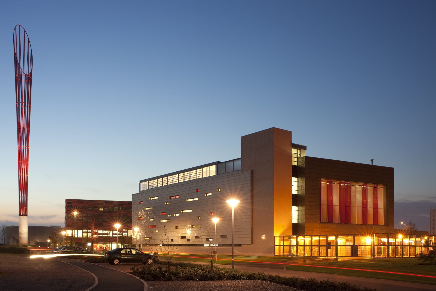 A simple palette of principal materials and finishes was selected to relate the building to the ʻfamilyʼ of other buildings within the Universityʼs masterplan. The development was part-funded by the East Midlands Development Agency.