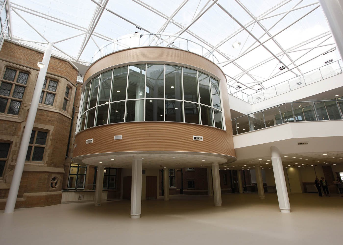 The sixth form centre is located on mezzanine floors that have been carefully designed to minimise contact with the historic structure. An open ground floor plan provides dining facilities for the whole senior school, served by a new catering kitchen created within the existing building.