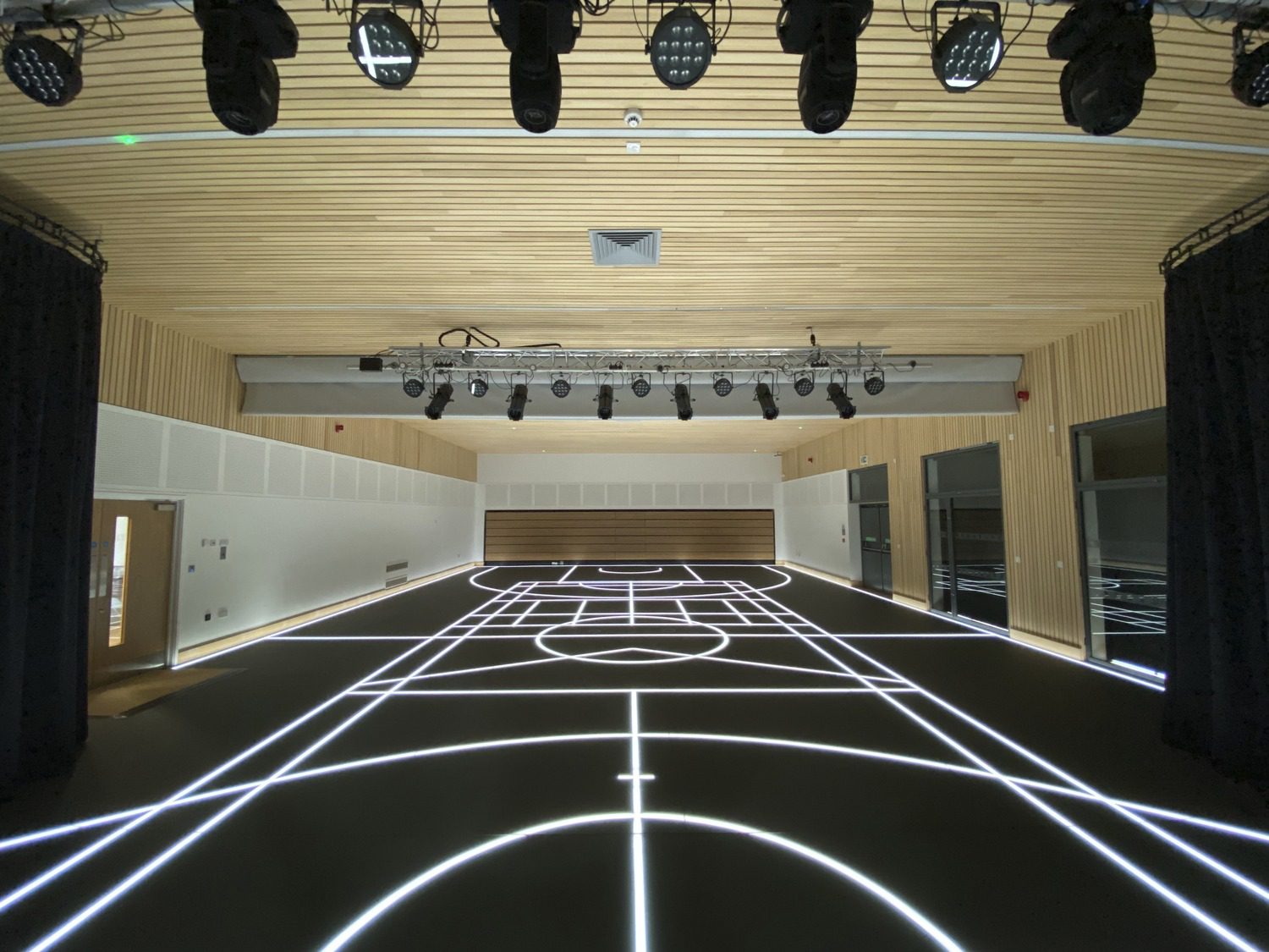 The project sought to convert the existing hall into a combined sports hall and performance space by removing the stage, wing walls and existing floor; and installing a brand new cutting edge glass sports floor and a set of bleacher seating that can fold back into a recess at the back of the hall when it is in sports use. Improving the acoustics of the space, installing proper ventilation and underfloor heating were also key to the project.