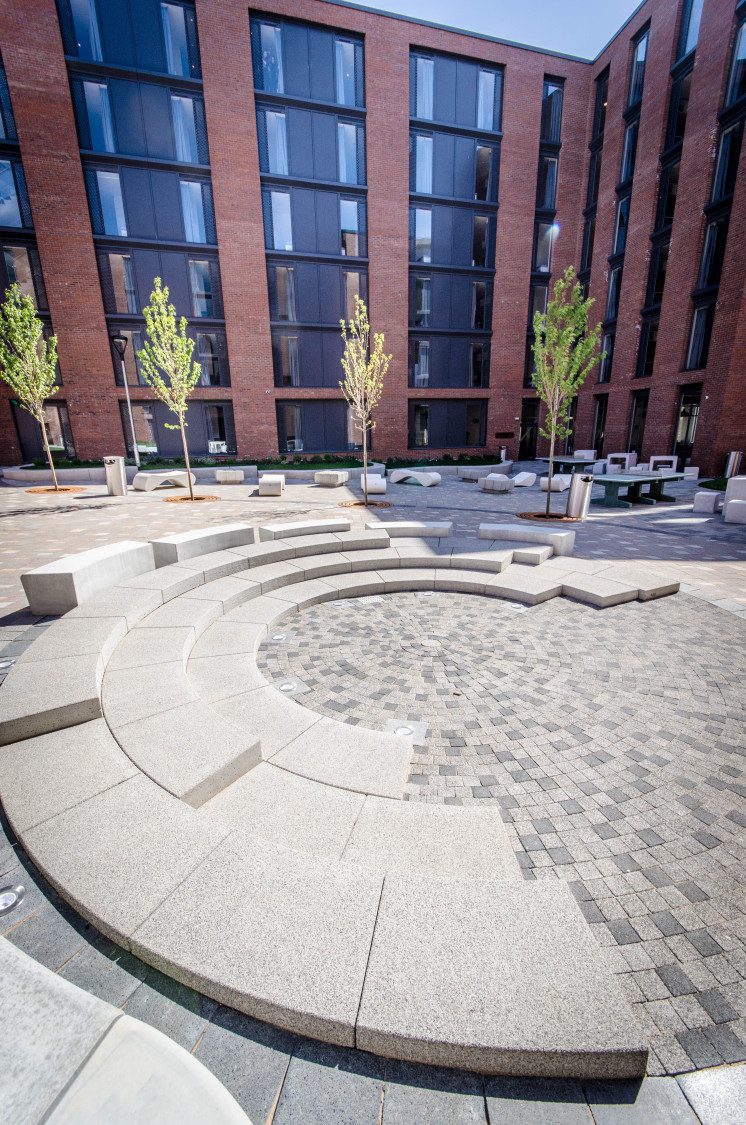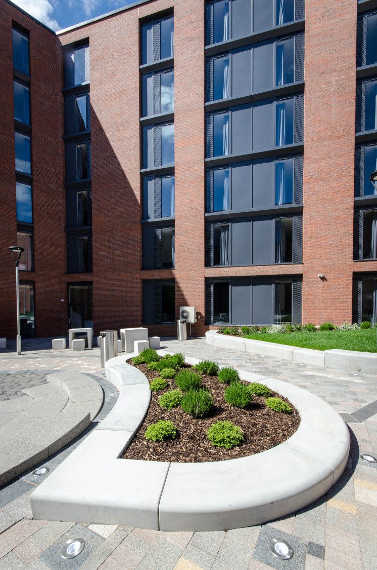 Working in collaborations with our architecture and interiors teams and in close partnership with Viridis Real Estate and CRM Students Management, the landscape design was developed to offer functional and flexible external spaces that would accommodate numerous activities for the large number of students. The design approach for the central courtyard was modern and organic, creating adaptable spaces that can be used for quiet study, relaxing, socialising or performance. Each zone of the courtyard is given purpose with circulation between each student building free flowing.