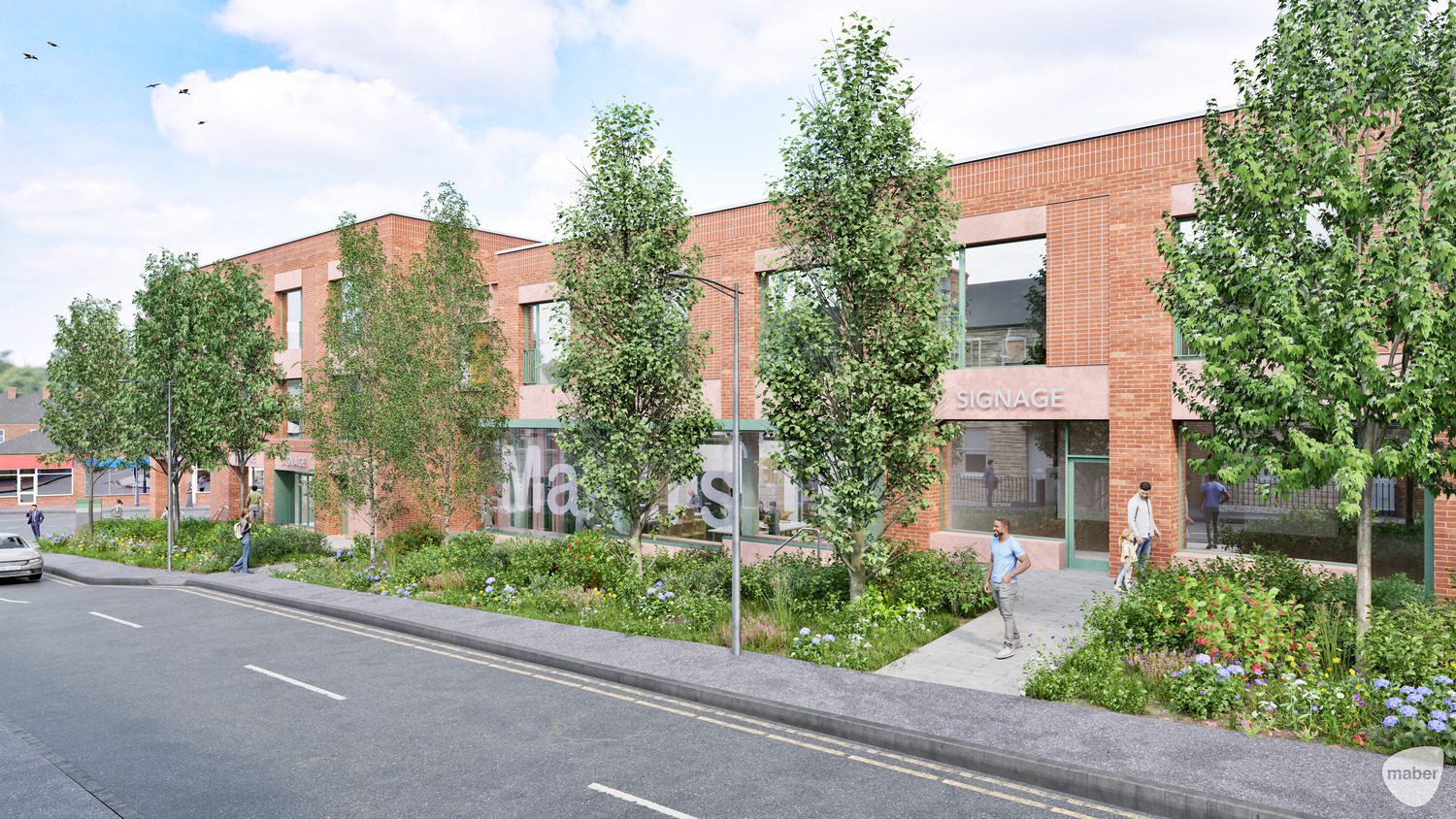 A three-storey block at the Derby Road junction creates a focal point for the site. Positioned closest to the existing commercial buildings, it reinforces the intended function of the hub and integrates it into the heart of the town. As the topography rises up Victoria Street, the second block steps down to two storeys, respecting private dwellings on the opposite side of the street. New trees will create a ‘boulevard’ feel, partially screening this elevation from adjacent properties.